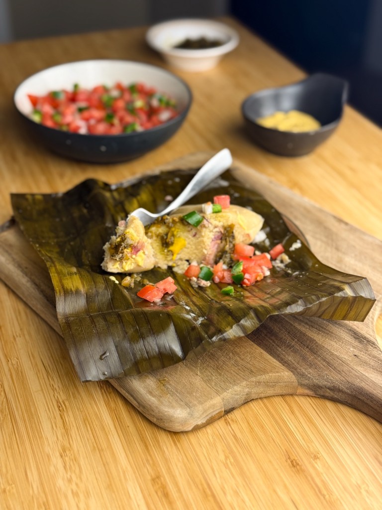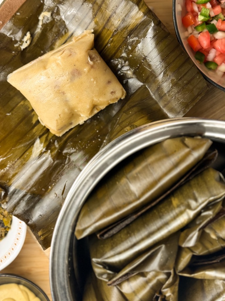 *If your banana leaf breaks, double wrap your tamal with another banana leaf. This helps prevent leaks, which could lead to burning.