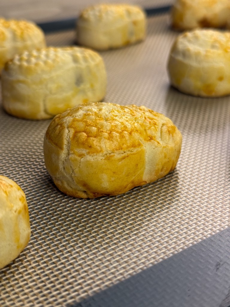 Take a small piece of dough from the mixing bowl in the refrigerator. You want an amount good for 2-3 cakes. Using a weighing scale, measure 20-25 g for each cookie, depending on the size of your mold. Roll into a ball. Flatten into a disc with a rolling pin, making sure the edges are thinner than the middle. If necessary, lightly flour the work surface to protect your dough disc from breaking. Take 1 ½- 2 tsp of pineapple jam and place in the middle of the disc. Take the edges of the dough to meet in the middle and pinch. Working quickly, roll gently between your palms before using a lightly floured mold or press. Freeze your pineapple cakes for 15- 25 minutes.