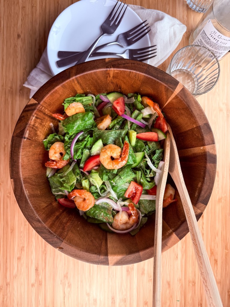 Toss the salad, shrimp and a few spoonfuls of dressing together. Serve immediately.