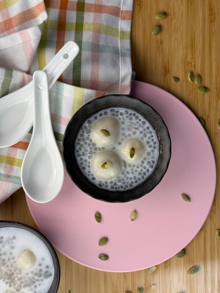 To assemble, pour coconut beverage sweetened with your sweetener of choice in a shallow bowl. Gently place 3-5 tangyuan in the middle and add tapioca balls, if desired. Feel free to garnish with more pepitas. Serve immediately.