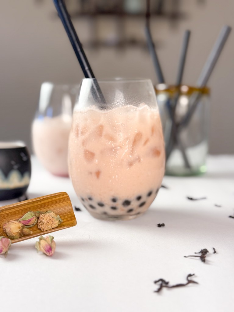 To serve, layer boba pearls (if desired), ice, 1 cup strawberry rose tea, and 1 cup coconut beverage. Stir just before serving. Serve immediately.
