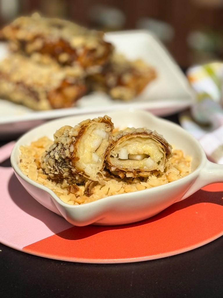 🌴Banana and coconut wrapped in golden crisp lumpia, rolled in caramel and crushed macadamia nuts.
