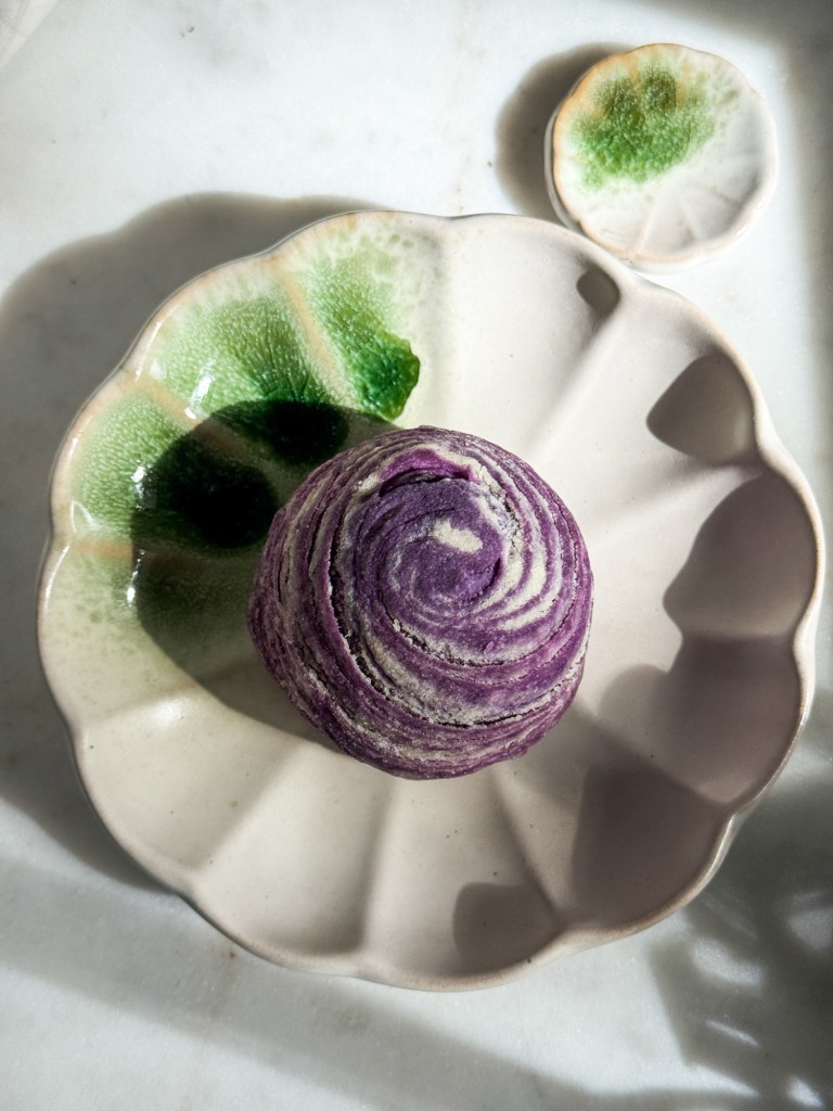 This recipe draws inspiration from traditional Teochew-style spiral mooncakes, known for their delicate swirl and tender, flaky texture. I swapped traditional fillings for homemade ube halaya, a creamy, coconut-laced purple yam jam, as a nod to beloved Filipino flavors.