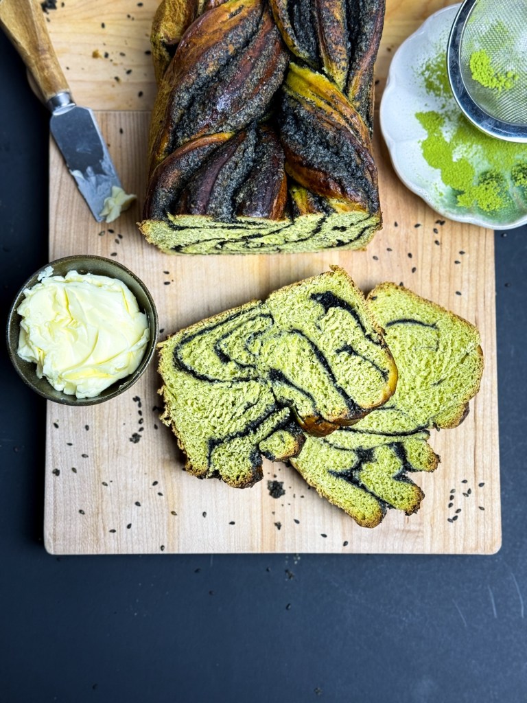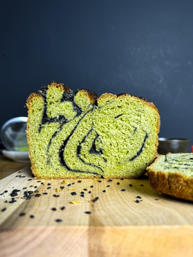 Visually stunning: Matcha green and black sesame create a dramatic marbled loaf, perfect for Halloween or any fall gathering.