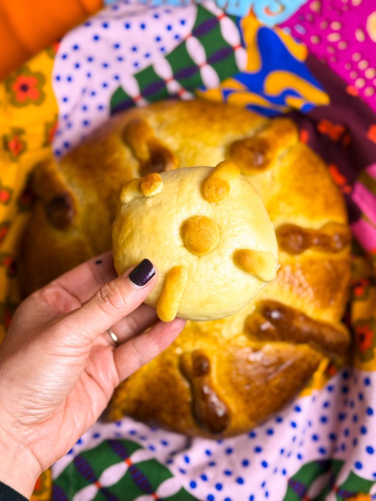 Each loaf we bake reminds us of how traditions evolve across generations and continents. In our home, pan de muerto has become a bridge that connects our roots to the present and honors loved ones who are no longer with us. We teach our girls that remembrance can be beautiful, joyful, and sweet with every bone that’s shaped and carefully placed on each bun.